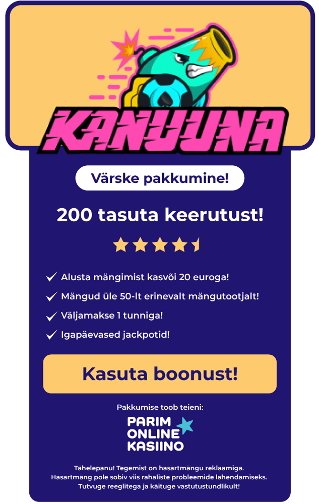 “Meie Parimonlinekasiinos soovitame soojalt Kanuuna kasiinot! Kanuuna kasiinos saad mĂ€ngida kiiresti ja mugavalt Eesti pangalinkide kaudu ning kasiinol on mĂ”istagi Eesti hasartmĂ€nguluba. Siin leidub lai valik mĂ€nge, sealhulgas slotikad, jackpotid ja live-diileriga kasiinomĂ€ngud! Lisaks annab Kanuuna praegu uutele mĂ€ngijatele hĂ€id tervitusboonuseid! Kanuuna on selge valik neile, kes otsivad uut kiiret ja turvalist kasiinot Eesti hasartmĂ€nguloaga.”